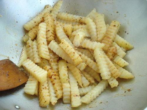 5. 调味:将炸好的土豆片放入碗中,加入适量的盐、孜然粉、辣椒粉等调料,搅拌均匀。